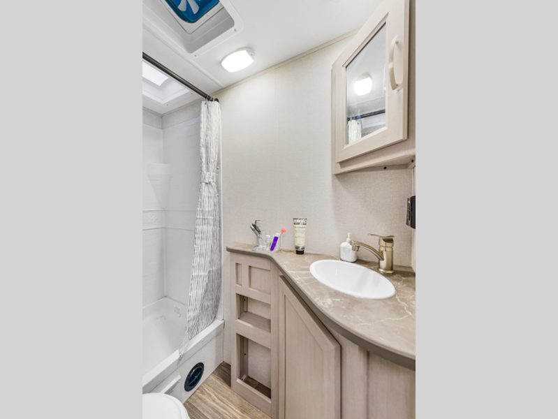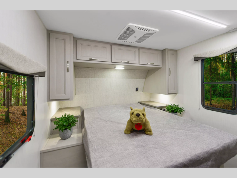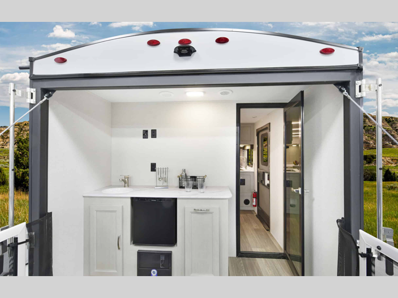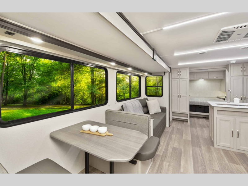 There is over 40 cu. ft. of pass-through storage so you can bring all of the outdoor essentials, and the industry first under-bed pet palace design provides a cozy place for your pet too. The strong foundation consists of a powder coated structural I-beam frame and durable Azdel composite laminated sidewalls. You'll find night shades inside, along with hidden hinges on the cabinetry, multiple 110V and USB outlets, seamless edge kitchen countertops throughout, and many more comforts.